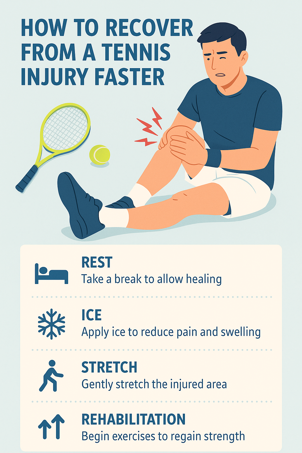 Quick guide: Recover from a tennis injury faster by using rest, ice therapy, gentle stretching, and rehabilitation exercises.